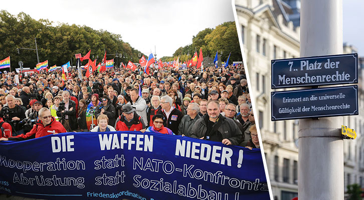 Bild: Symbolbild Friedensdemo (Berlin): Fraktion Die Linke. Im Bundestag, Flickr, CC BY 2.0; Straßenschild: Manfred Werner (Tsui), Wikimedia Commons, CC BY-SA 4.0; Komposition: Wochenblick / Eigenes Werk