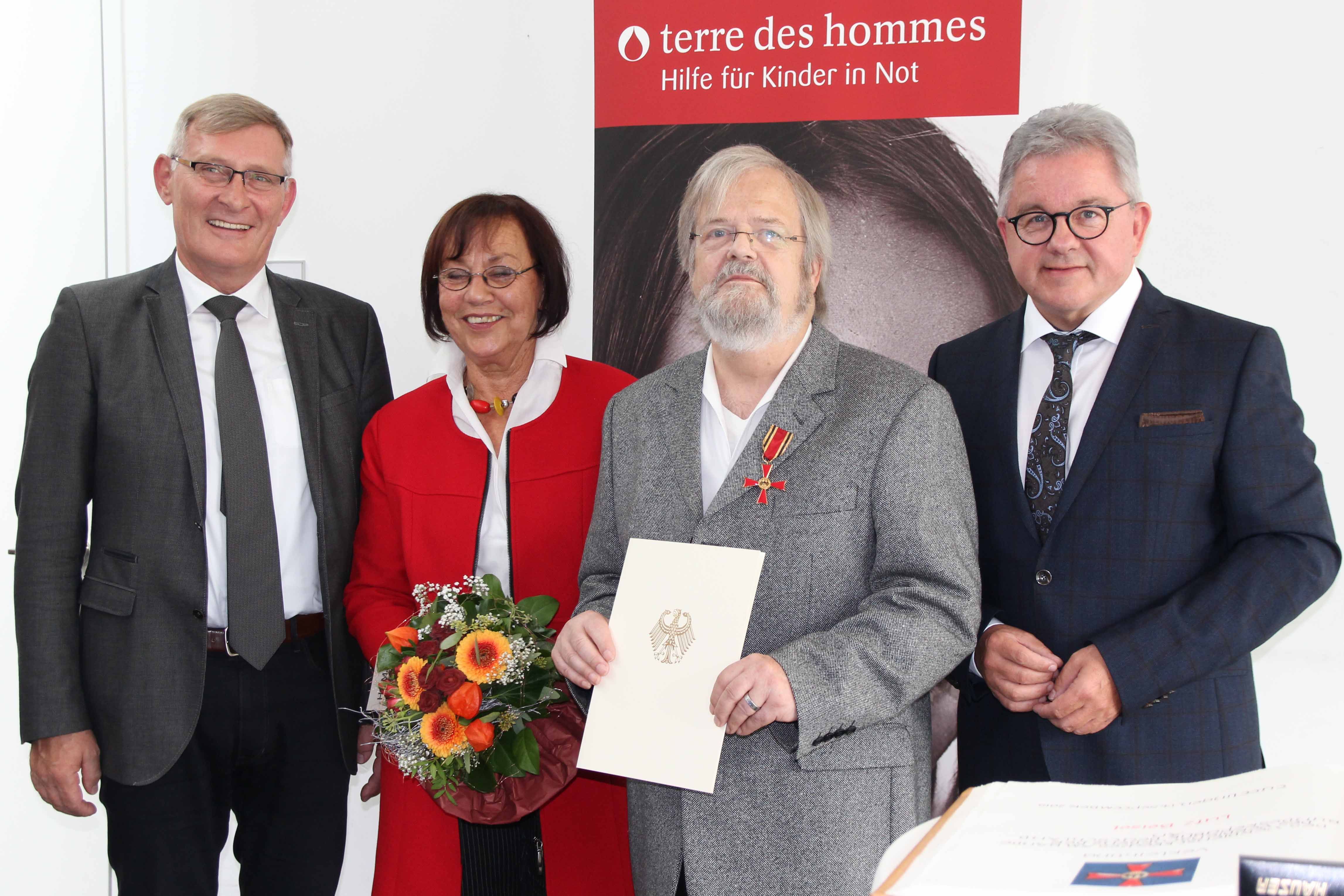 Verleihung des Bundesverdienstkreuzes an terre des hommes-Gründer Lutz Beisel: (v.l.) Tuttlingens Oberbürgermeister Michael Beck, Sigrid Debus-Beisel, Lutz Beisel, Justizminister Baden-Württembergs Guido Wolf. Bild: "obs/terre des hommes Deutschland e.V./Stadt Tuttlingen"