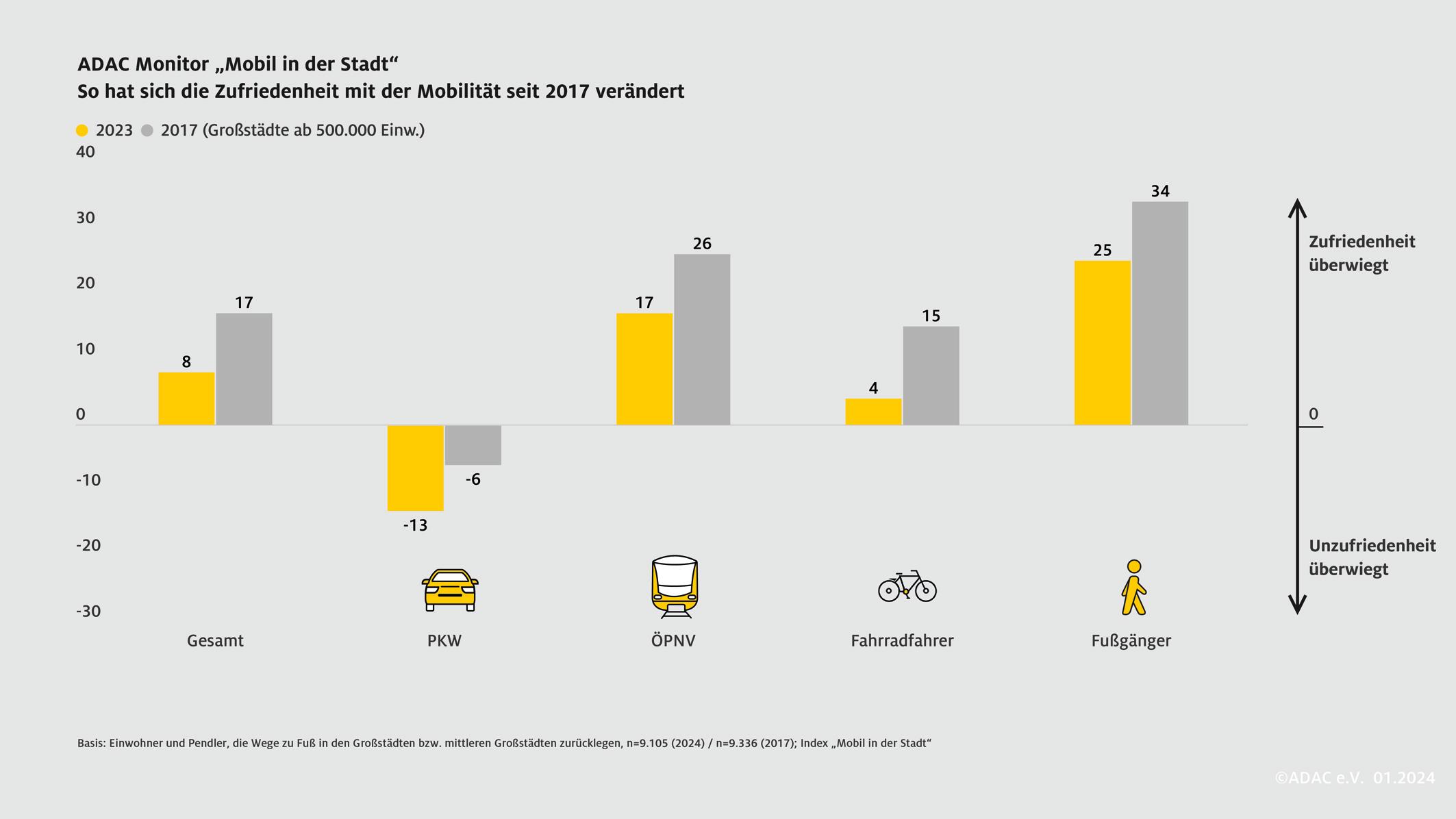 ADAC Monitor "Mobil in der Stadt": Die Zufriedenheit mit der Mobilitätssituation in den Großstädten ist im Vergleich zu 2017 deutlich gesunken.
