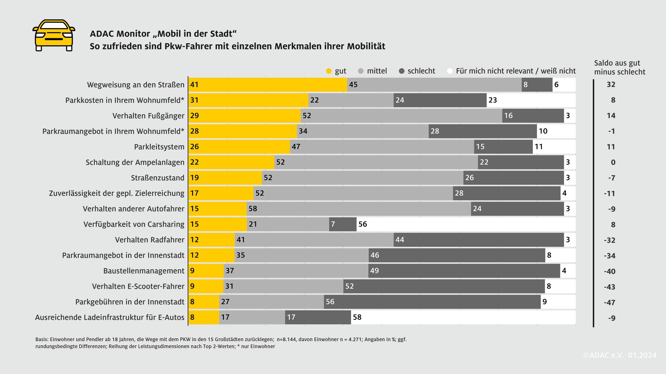 ADAC Monitor "Mobil in der Stadt": Pkw-Fahrer sind am unzufriedensten mit ihrer Mobilitätssituation in den Großstädten