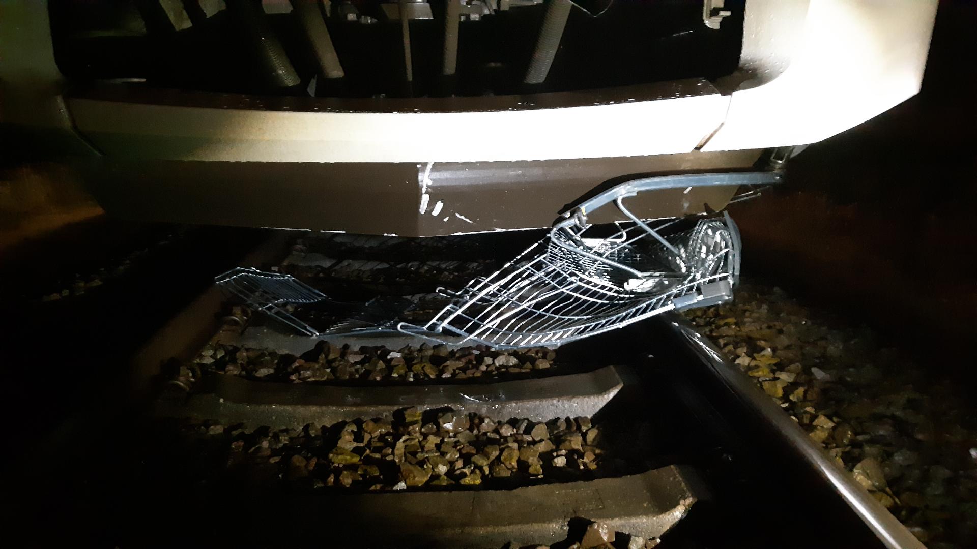 Der Einkaufswagen verkeilt unter der Lok. Bild: Polizei