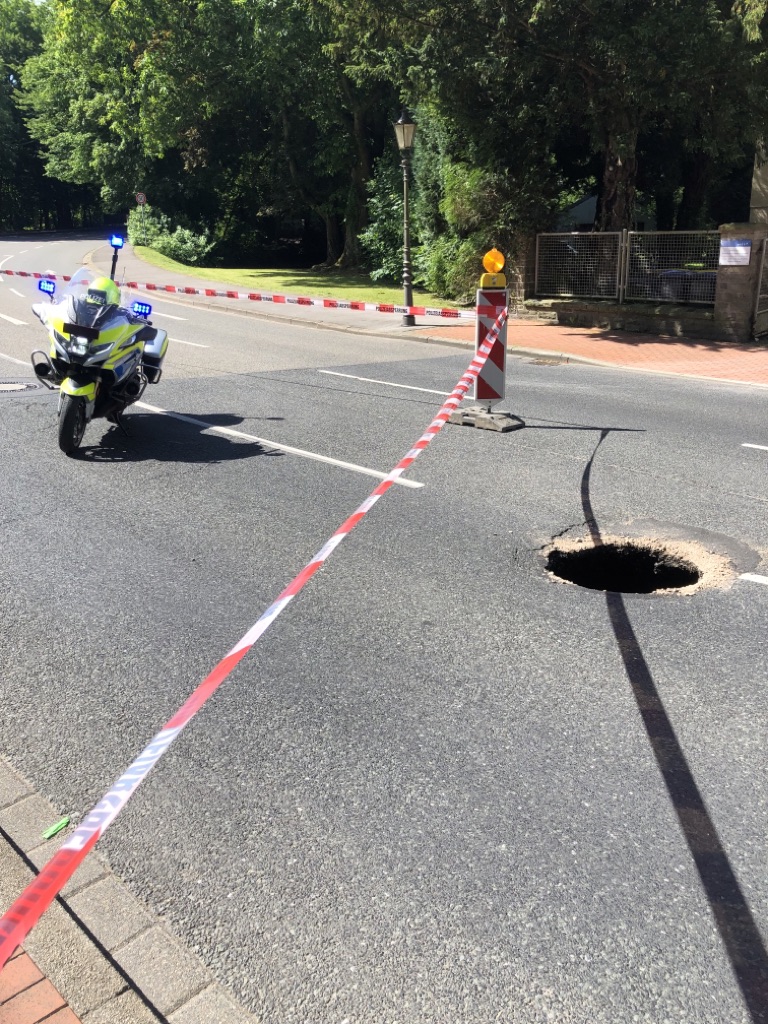 Die Straße wurde aufgrund der beschädigten Fahrbahndecke gesperrt. Bild: Polizei