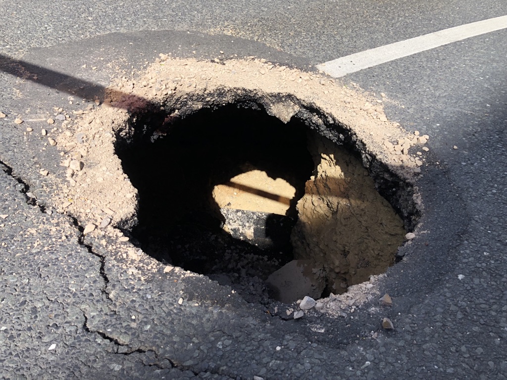 Die Fahrbahn wurde mehrere Meter tief auf der gesamten Breite der Straße unterspült. Bild: Polizei