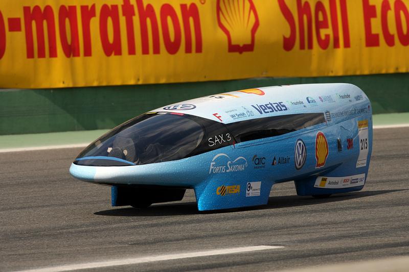 Das Ökomobil Sax 3 des Teams "Fortis Saxonia" (TU Chemnitz) fährt beim 25. Shell Eco-marathon auf dem Lausitzring. Foto: Reckimages/Shell