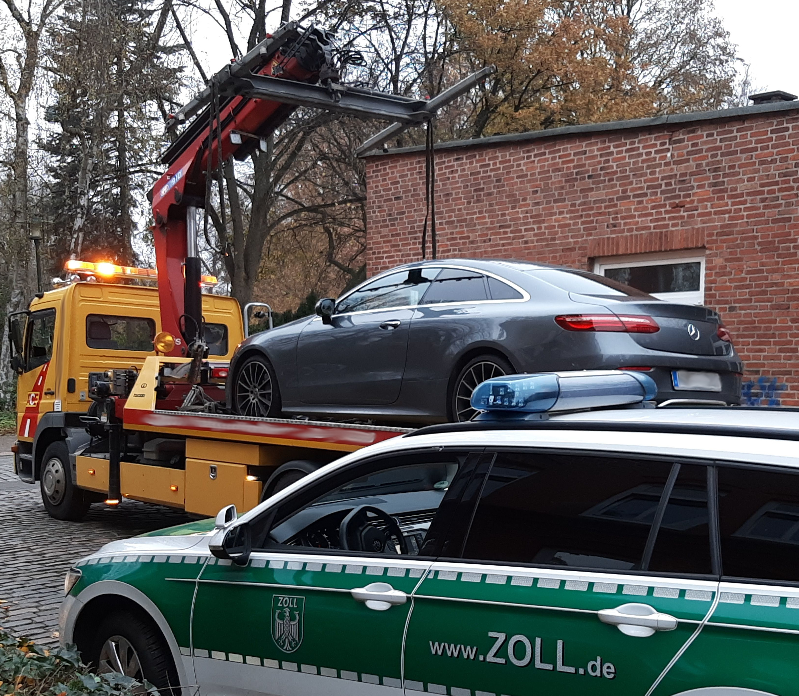 ZOLL: Gepfändetes Fahrzeug, Mercedes E-Klasse, wird abgeschleppt. Bild: Hauptzollamt Kiel
