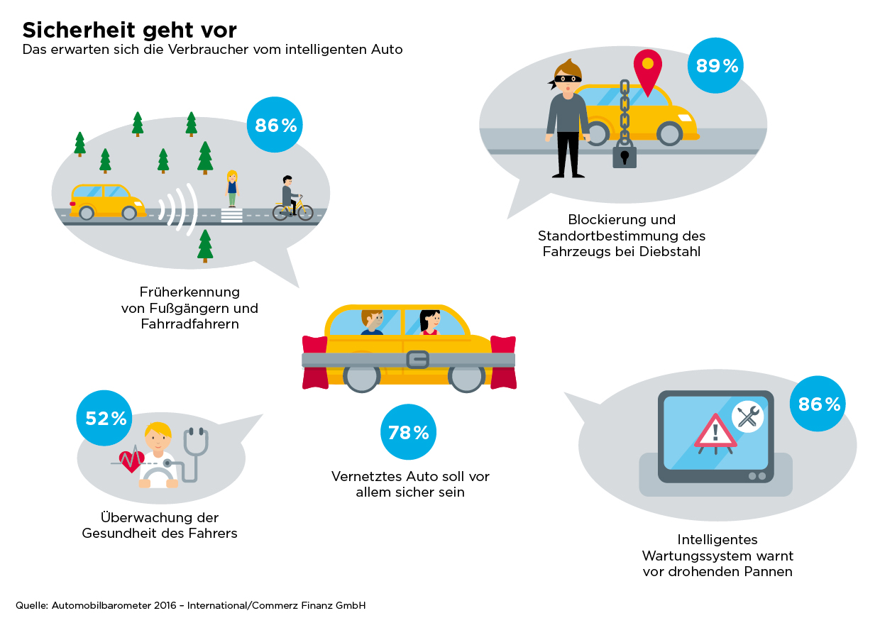 Die Verbraucher legen besonderen Wert auf Funktionen, die die Fahrt im vernetzten Auto sicherer machen. / Bild: "obs/Commerz Finanz GmbH"