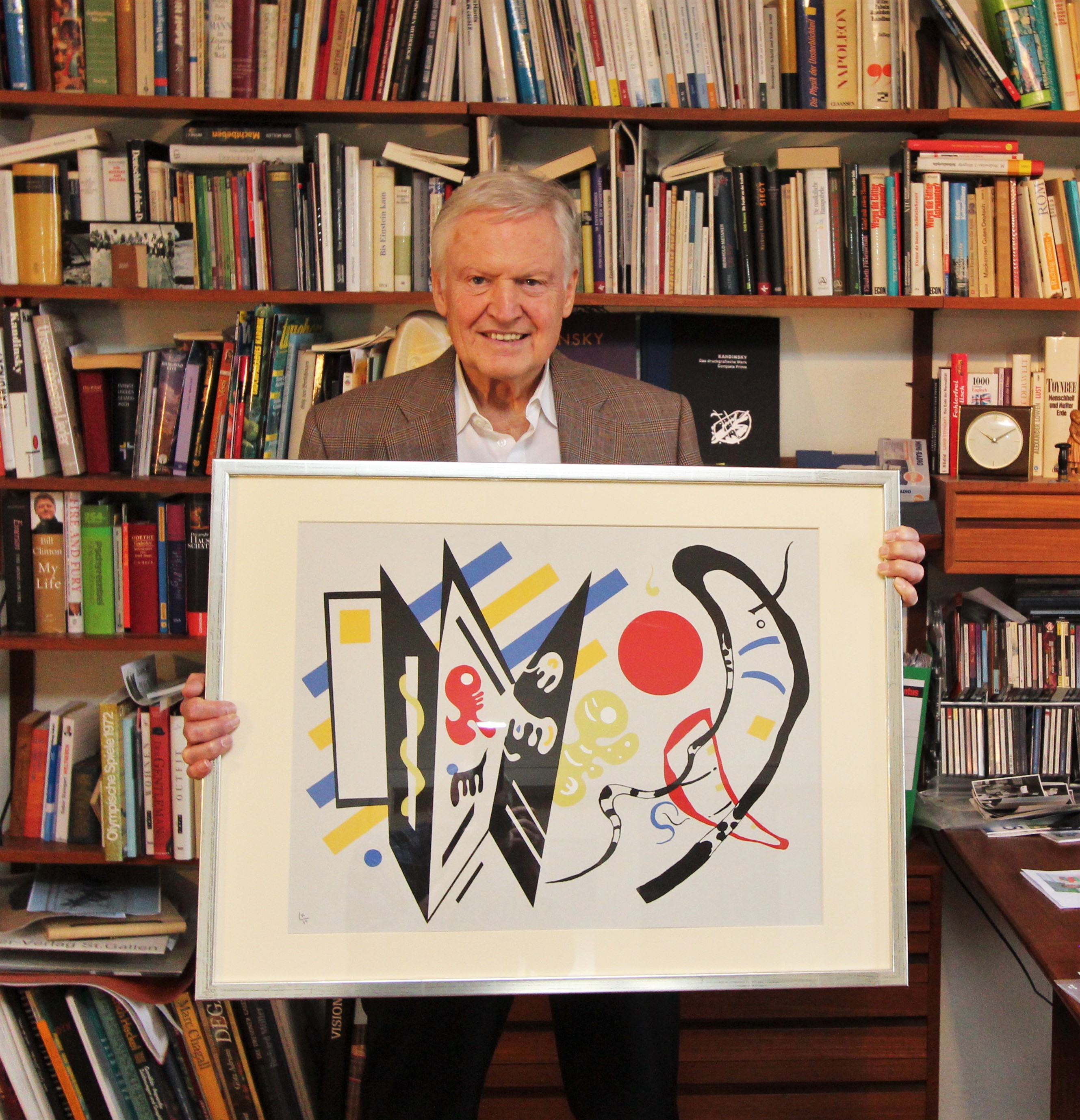 Wilhelm Heußer, Verleger aus Heilbronn, mit dem Kandinsky-Werk "Reciproque", das jetzt zugunsten der UNO-Flüchtlingshilfe angeboten wird. Bild: "obs/HW Verlag Wilhelm Heußer/Norbert Kick"