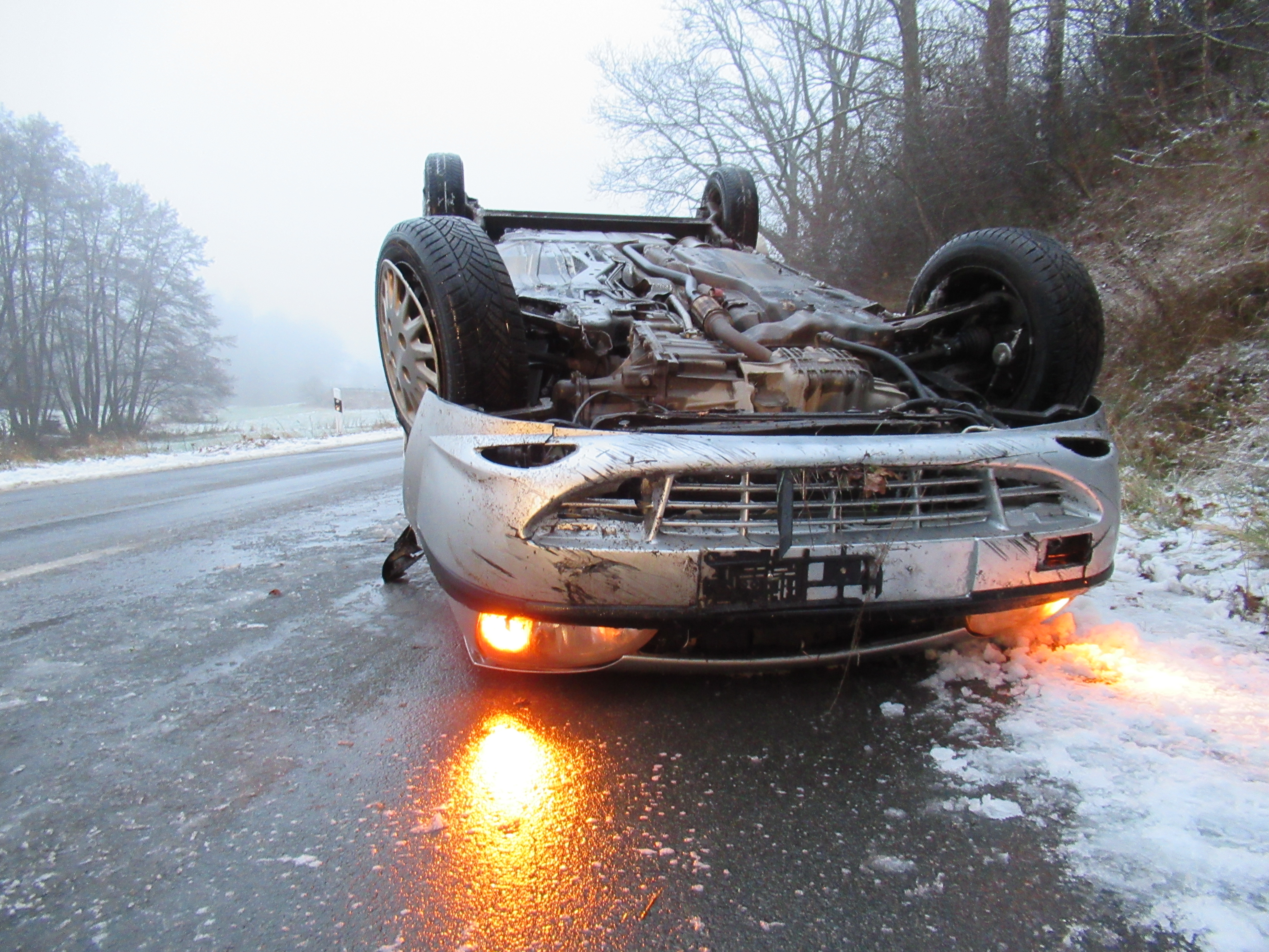 Auf der L 707 geriet der Fahrer dieses Kleinwagen ins Schleudern und überschlug sich. Bild: Polizei MK