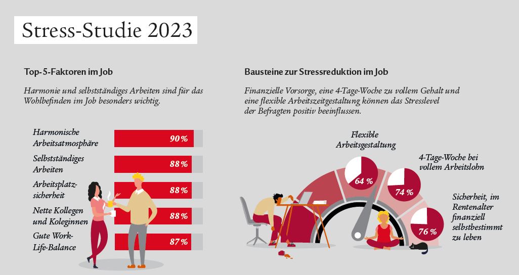 Zurück zu Arbeitswelt im Wandel: Für ein geringeres Stresslevel wünscht sich große Mehrheit Harmonie am Arbeitsplatz und eine Vier-Tage-Woche