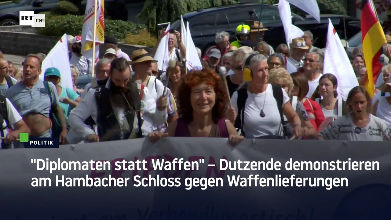 Zurück zu "Diplomaten statt Waffen" – Dutzende demonstrieren am Hambacher Schloss gegen Waffenlieferungen