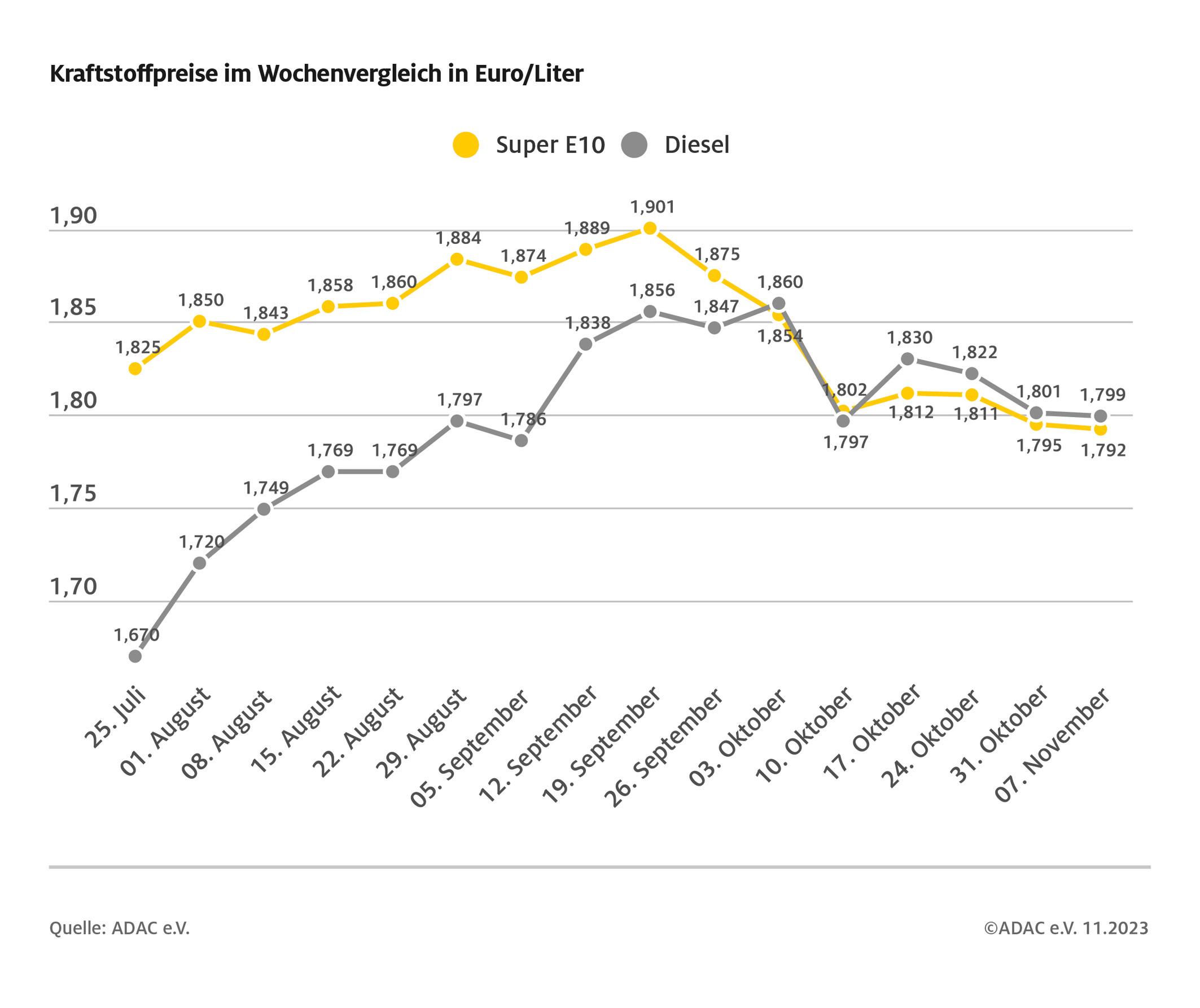 Zurück zu Benzin und Diesel geringfügig billiger: Preise beider Kraftstoffsorten knapp unter der Marke von 1,80 Euro