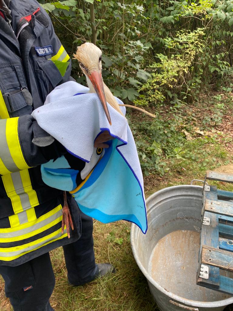Der Storch konnte aus seiner misslichen Lage befreit werden. Bild: Feuerwehr