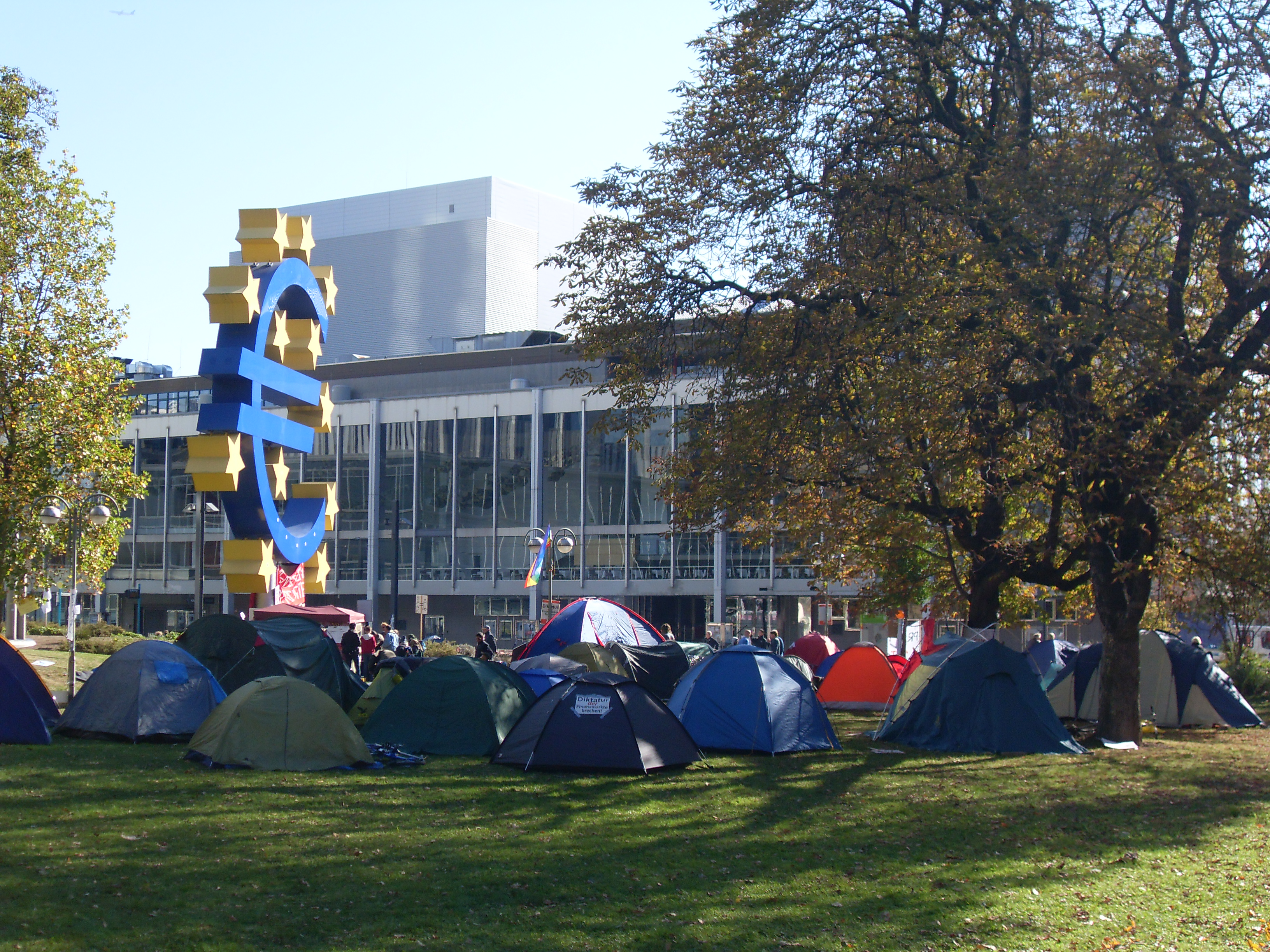 Zeltende Demonstranten auf dem Platz vor der EZB in Frankfurt am Main