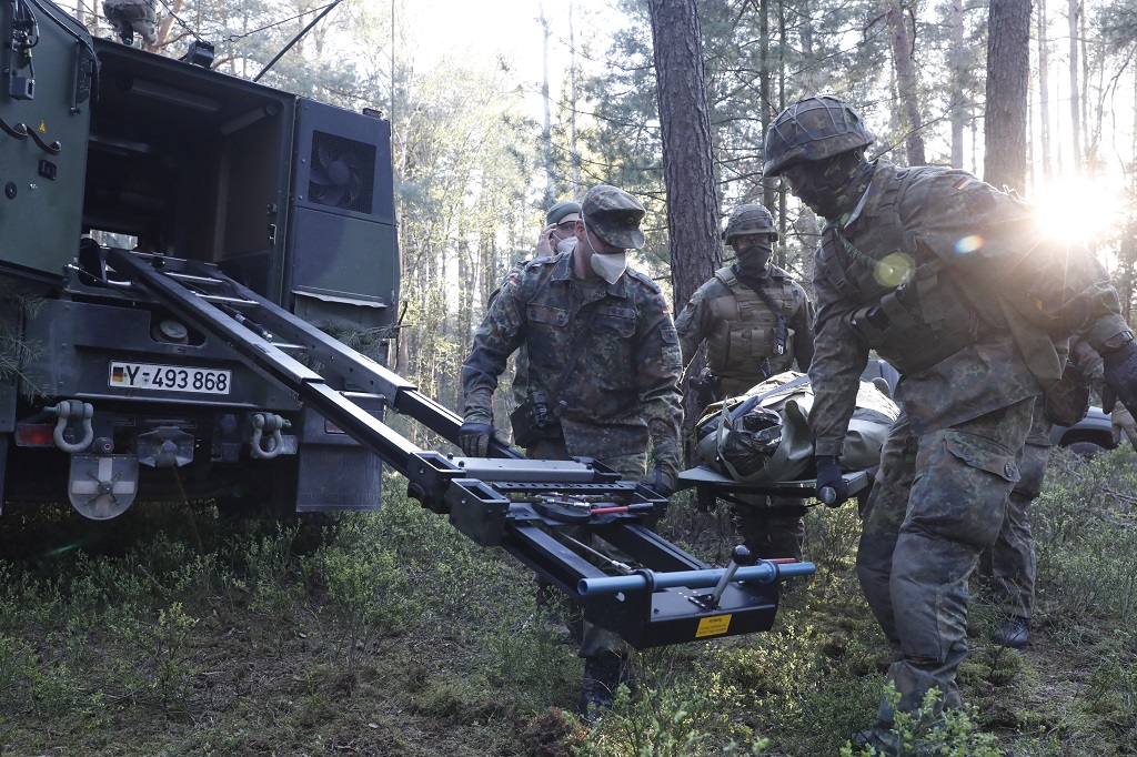 Um mit der Kampftruppe zusammenarbeiten zu können, müssen die Sanitätssoldatinnen und -soldaten sowohl die eigene Technik als auch das militärische Handwerkszeug beherrschen. Bild: Bundeswehr Fotograf: Kieron Kleinert