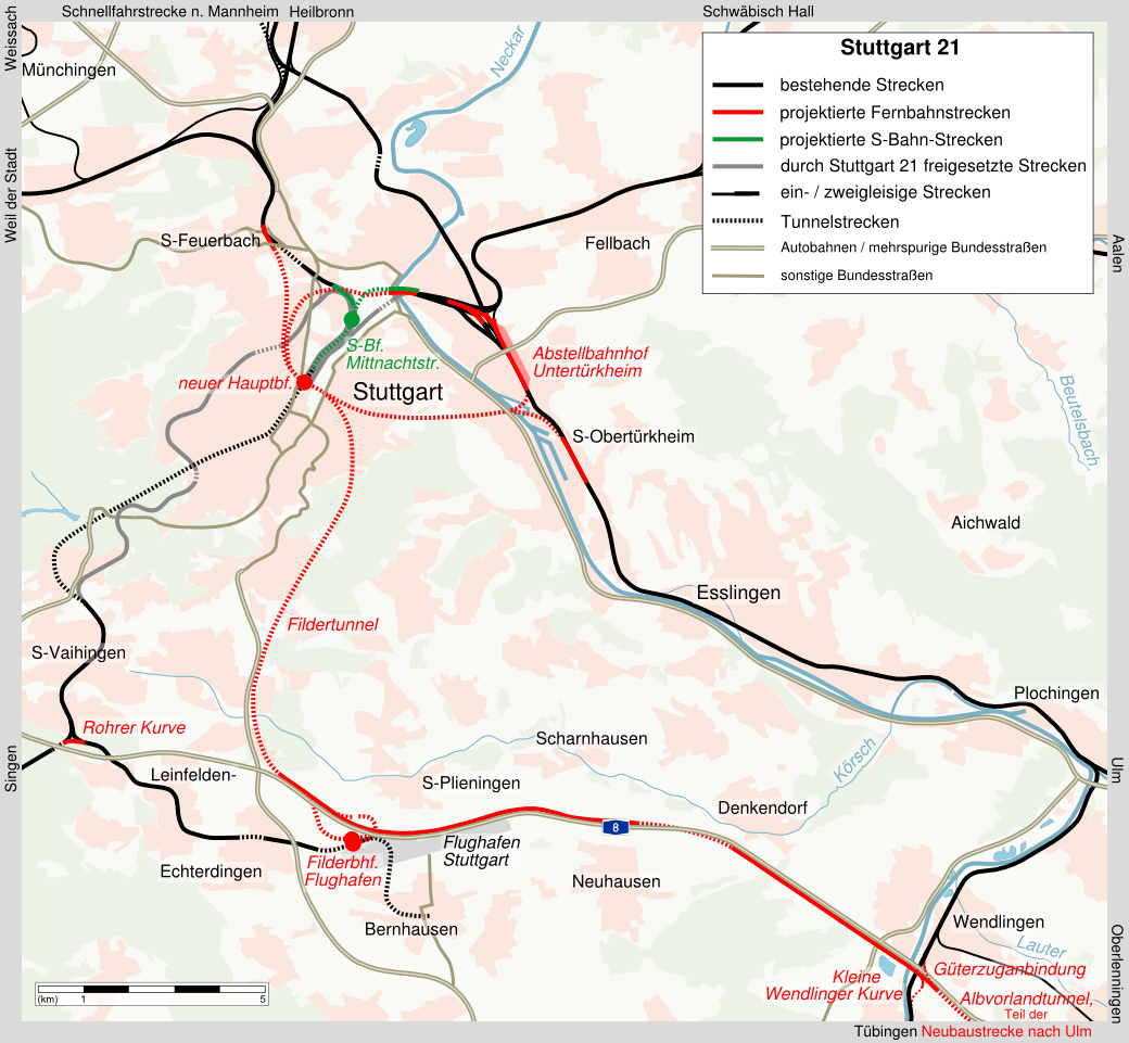 Überblick der im Zuge von Stuttgart 21 geplanten Veränderungen an Bahnanlagen im Raum Stuttgart