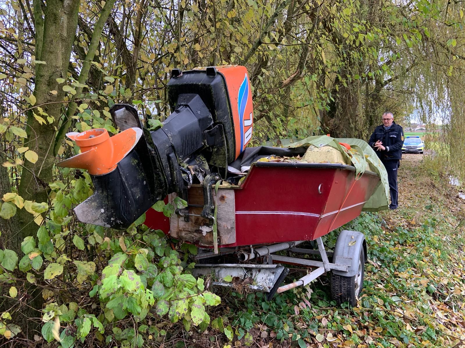 Die Polizei sucht den Besitzer dieses Anhängers mit einem Motorboot als Ladung Bild: Polizei