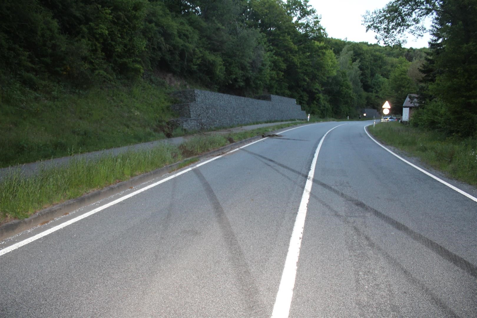 Über den Fuß- und Fahrradweg hinaus schleuderte der Wagen gegen die schwere Stein-Gambionen-Wand. Bild: Polizei