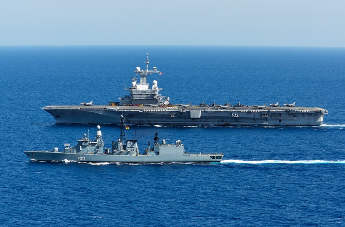 Fregatte Augsburg (F213) im Kriegsschiff-Verband um den französischen Flugzeugträger „Charles de Gaulle“ im Mittelmeer im Rahmen der Mission Counter Daesh II, am 14.10.2016.