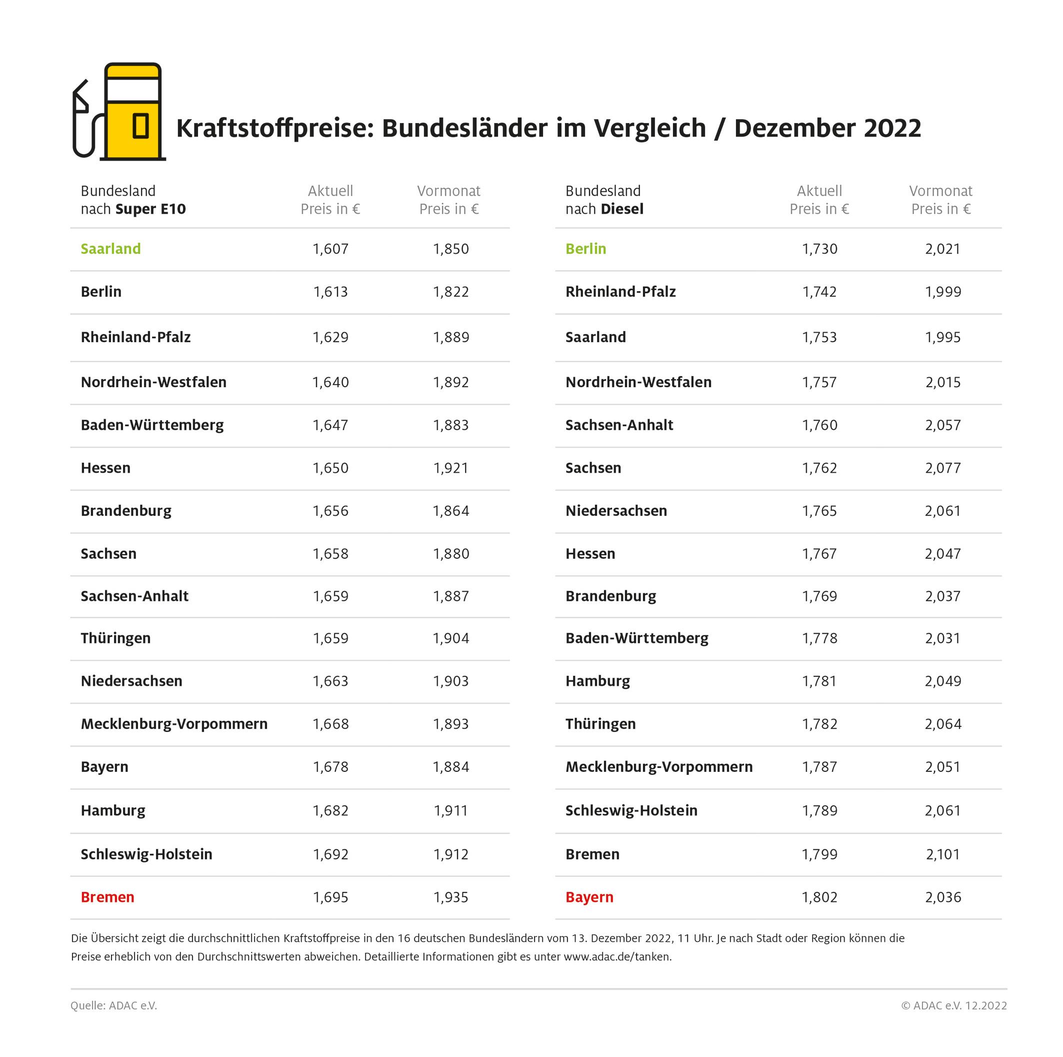 Zurück zu Bremen und Bayern mit den höchsten Spritpreisen Tanken in Berlin und im Saarland am preiswertesten regionale Preisunterschiede wieder etwas geringer