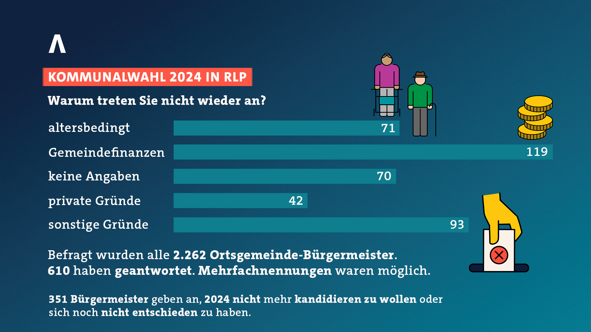 SÜDWESTRUNDFUNK SWR-Umfrage zur Kommunalwahl 2024: Viele Ortsbürgermeister und -bürgermeisterinnen in Rheinland-Pfalz wollen nicht erneut kandidieren. © SWR, honorarfrei - Verwendung gemäß der AGB im engen inhaltlichen, redaktionellen Zusammenhang mit genannter SWR-Sendung bei Nennung "Bild: SWR " (S2+). SWR Presse/Bildkommunikation, Stuttgart, Tel: 0711/929-12642, [email protected] / Weiterer Text über ots und www.presseportal.de/nr/7169 / Die Verwendung dieses Bildes für redaktionelle Zwecke ist unter Beachtung aller mitgeteilten Nutzungsbedingungen zulässig und dann auch honorarfrei. Veröffentlichung ausschließlich mit Bildrechte-Hinweis. Bildrechte: SWR Fotograf: SWR - Südwestrundfunk