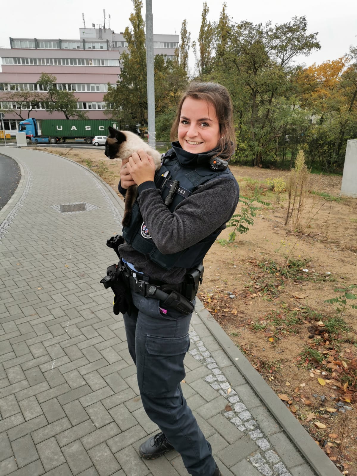 Polizeikommissarin Katalin Hajnadi mit dem geretteten Kätzchen. Bild: Polizei