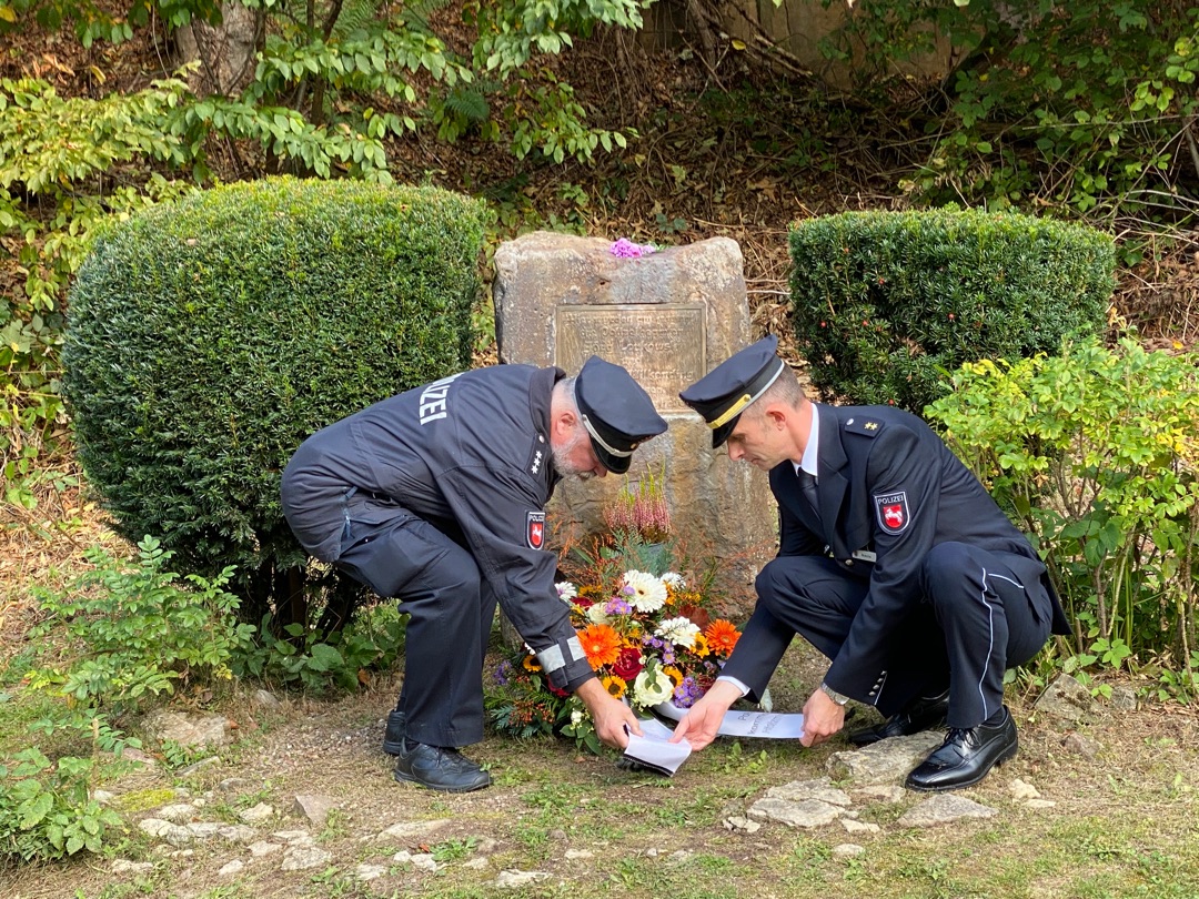 Gewerkschaftsvertreter Ralf Lorasch (links) und Oliver Busche, Leiter des Polizeikommissariats Holzminden, bei der Kranzniederlegung am Gedenkstein. Bild: Polizei