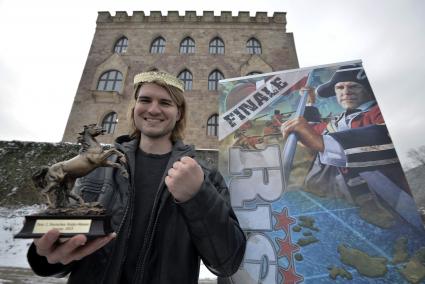 Jens Jung, Sieger der 2. Deutschen Risiko-Meisterschaft vor dem Hambacher Schloss. Bild: "obs/HASBRO Deutschland GmbH"