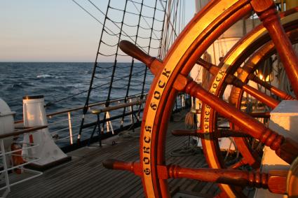 Steuerräder (Hauptruder) der GORCH FOCK im Sonnenaufgang.