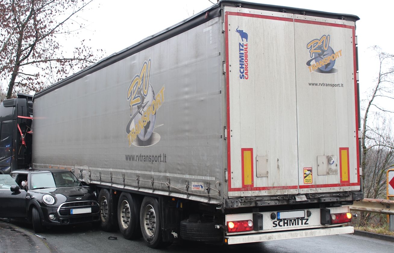 Zurück zu Olpe: Pkw gerät unter Sattelauflieger - Schutzengel hatten viel zu tun