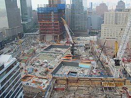 Ground Zero im Juli 2010, die Baustelle des Memorials in der Mitte, links dahinter das One World Trade Center. Bild: Chris Bridges