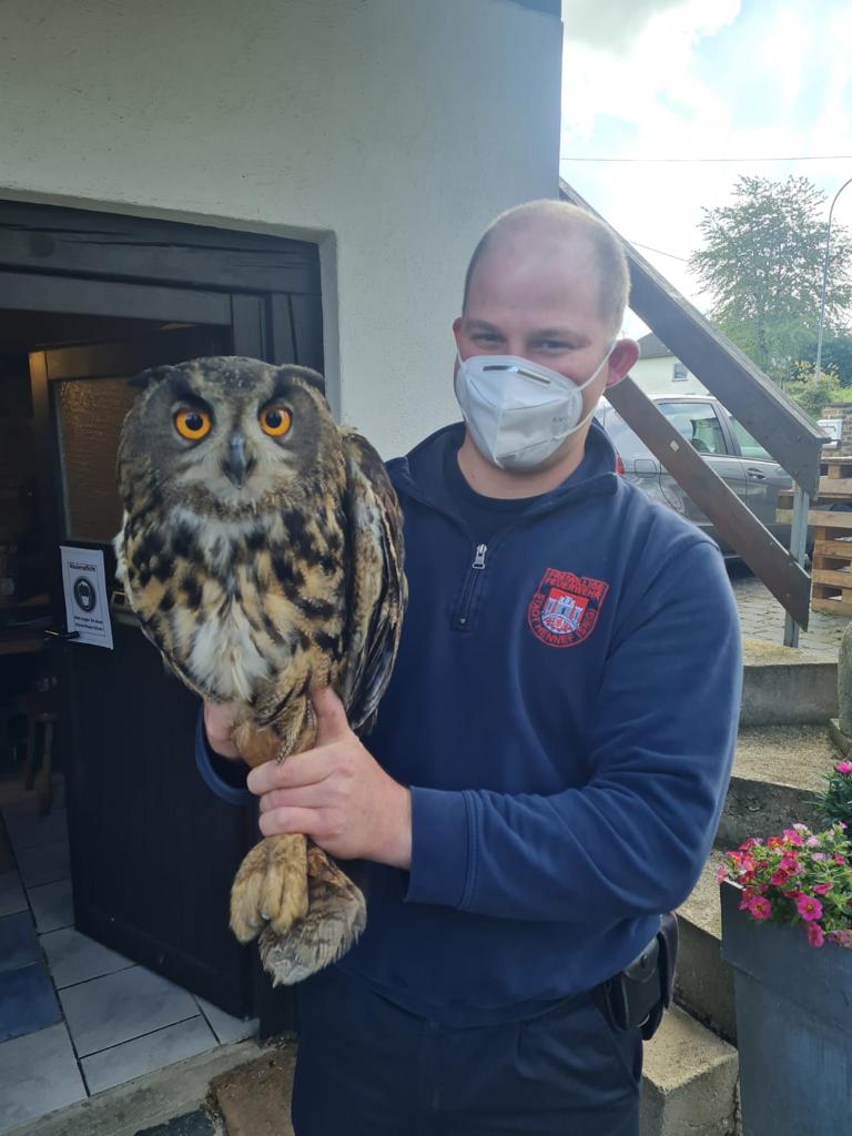 Fabian Herde mit gerettetem Uhu Bild: Feuerwehr
