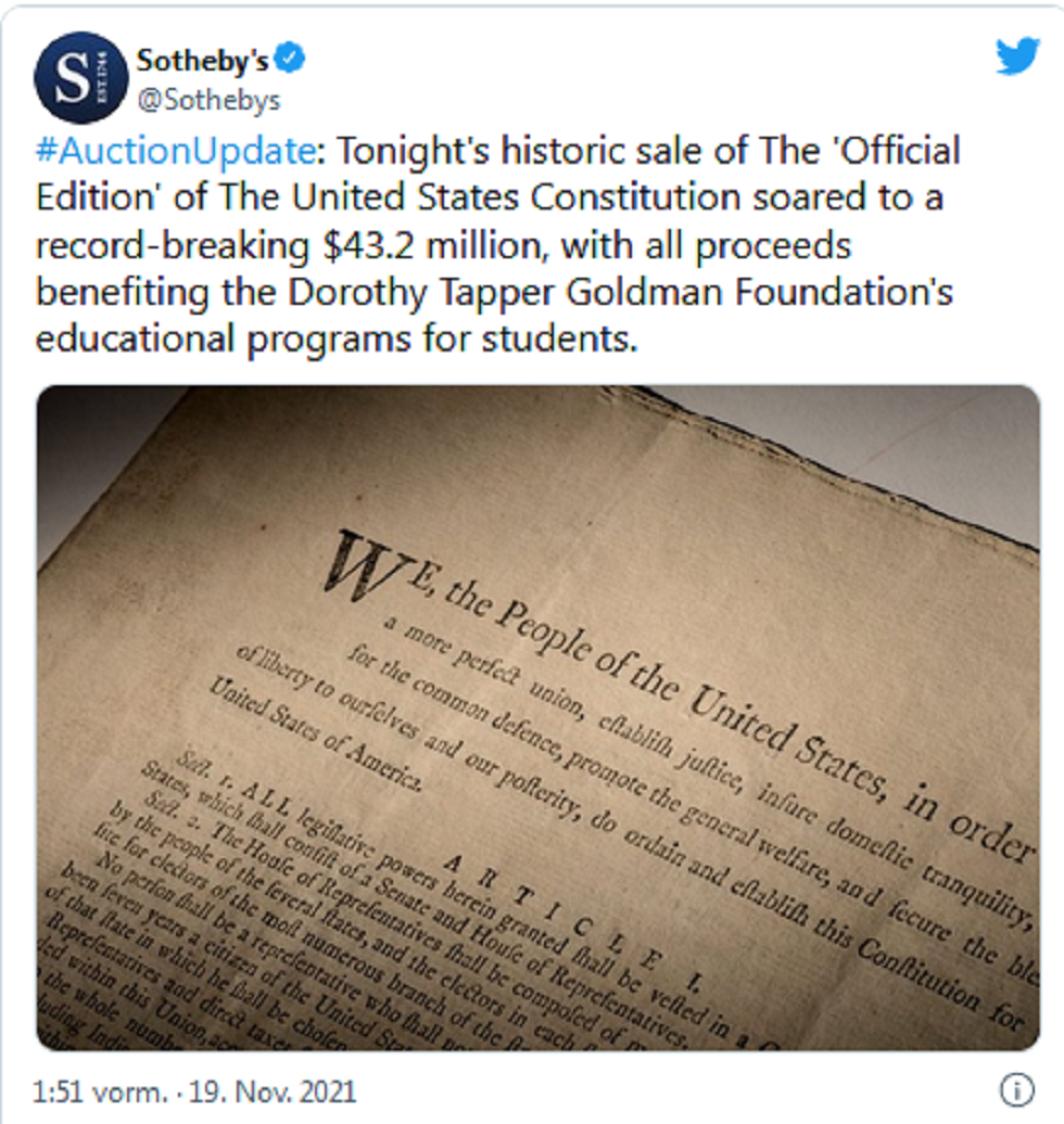 Zurück zu Versteigerung einer Erstausgabe von US-Verfassung für 38 Millionen Euro