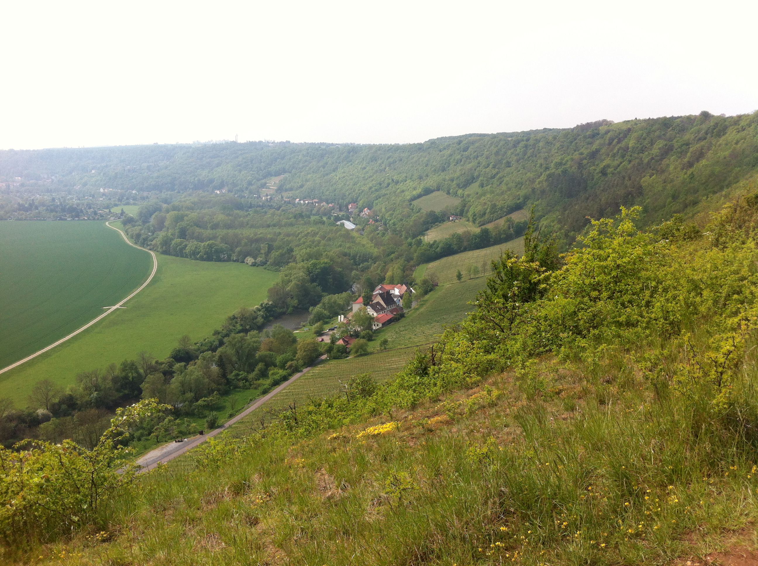 Naturpark Saale-Unstrut-Triasland; in der Bildmitte das Landesweingut Kloster Pforta an der Saale, Hangbereiche rechts im Bild weitgehend im Naturschutzgebiet „Göttersitz“