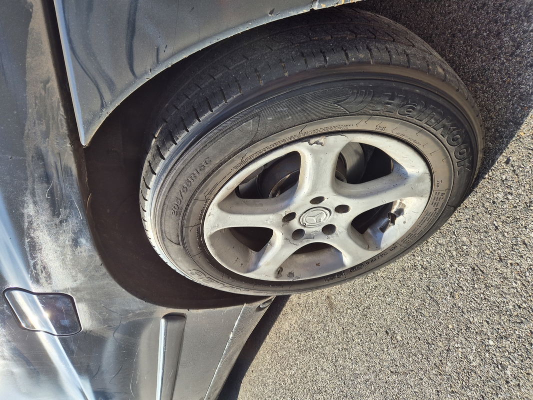 Das Bild zeigt einen der am Fahrzeug montierten Reifen, der deutliche Überlastungsschäden aufweist. Bild: Polizei