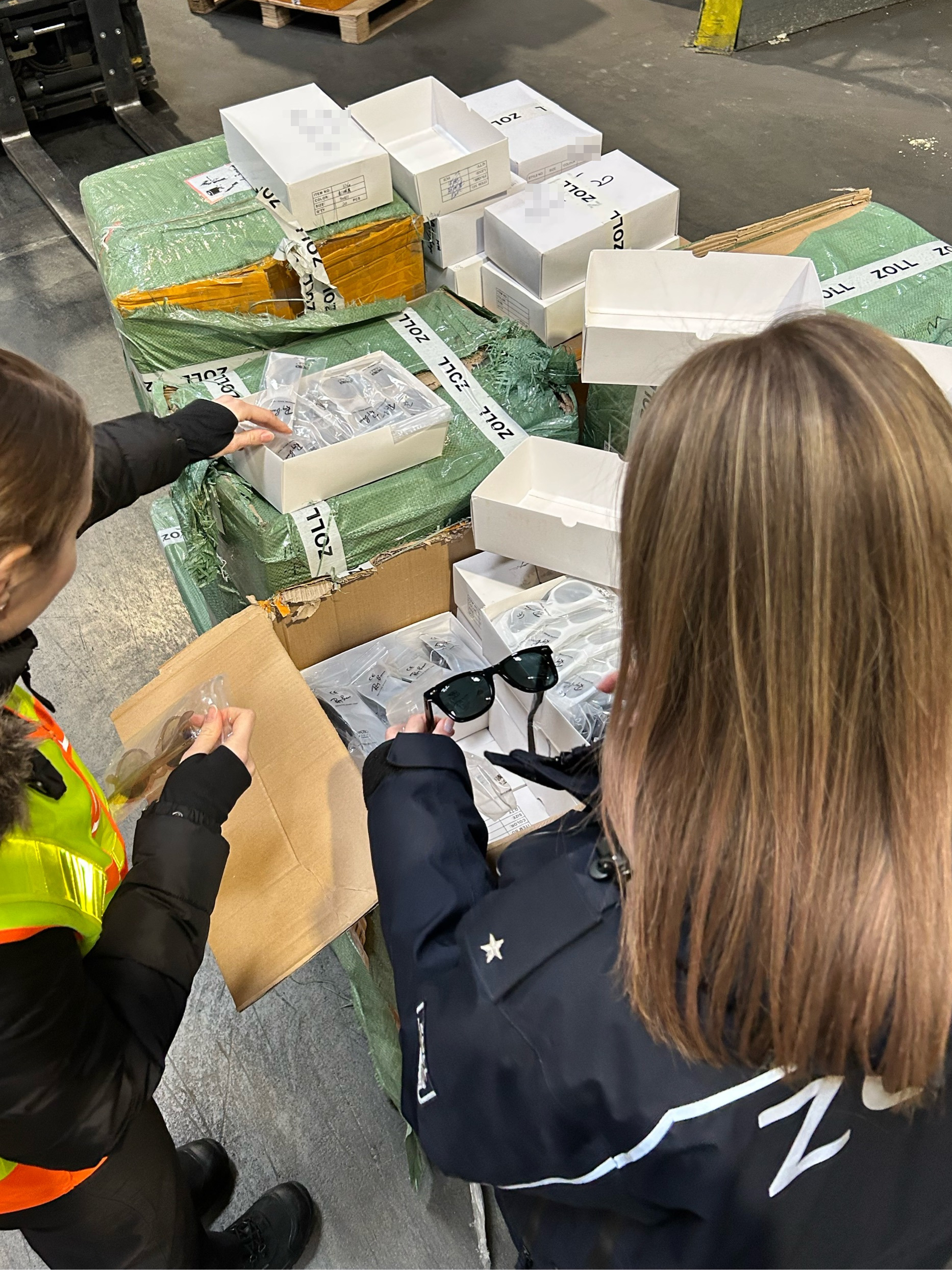 Eine der Palette voll beschlagnahmter Sonnenbrillen