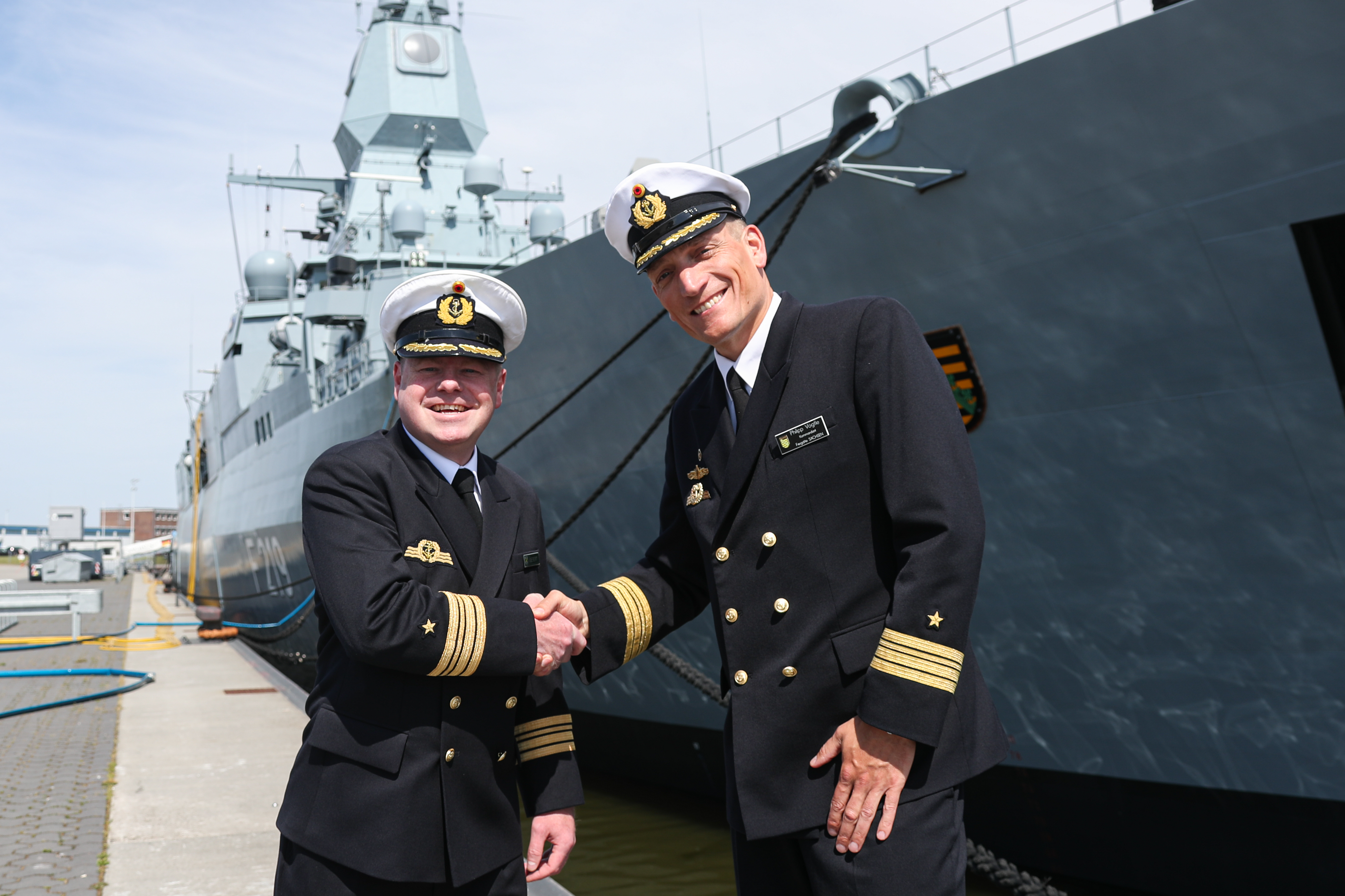 Der neue und der alte Kommandant der Fregatte „Sachsen“ am Bug der Fregatte. Links der neue Kommandant, Fregattenkapitän Thomas Liebert. Recht der alte Kommandant, Fregattenkapitän Philipp Vögtle. Bild: Leon Rodewald