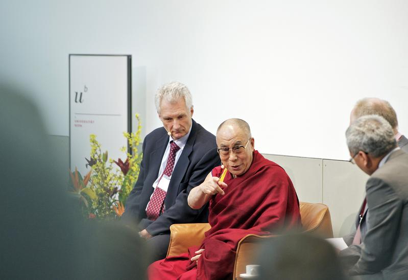 Der Dalai Lama beantwortet im Beisein von Rektor Martin Täuber engagiert die Fragen der Studierenden an der Universität Bern. Bild: Universität Bern / Manu Friederich.
