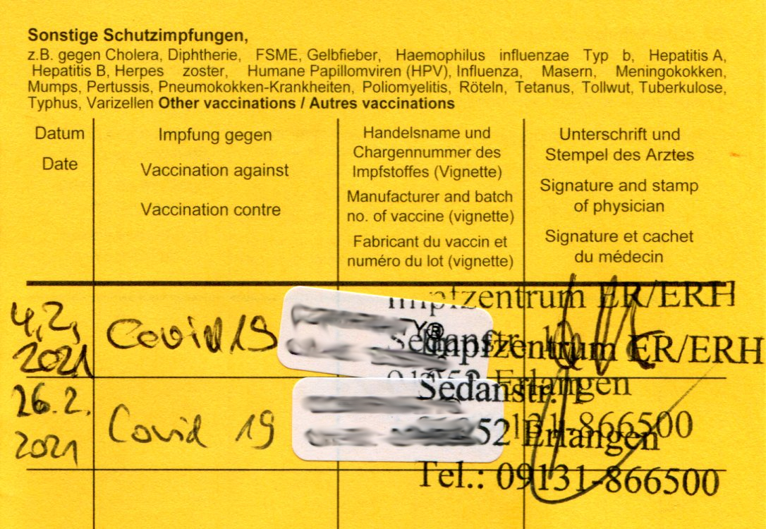 Internationaler Impfpass mit einer vollständigen Corona-Impfung (hier: Comirnaty)