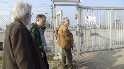 Mitglieder der Bürgerinitiative "Lebensqualität" gegen den Kavernenbetrieb in Etzel (v.l.n.r.: Franz Kreuzburg, Andreas Rudolph, Arendt Hindriksen) entdecken mit dem NDR-Kamerateam die ungesicherte Tür am Eingang zum sogenannten Verteilerplatz 10 bei Etzel. Bild: NDR" (S2).
