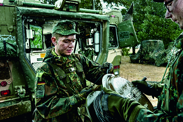 IT-Soldat bei einer Geländeübung an einem geschützen Gefechtsfahrzeug