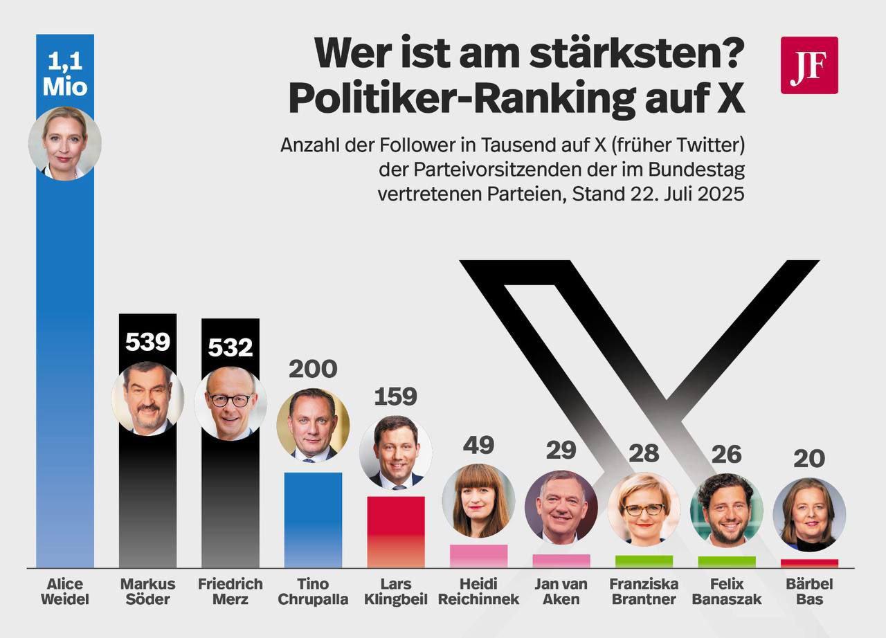 Beliebtheit von Politikern anhand von Followern auf der Plattform X (Ex- Twitter), Stand Juli 2025