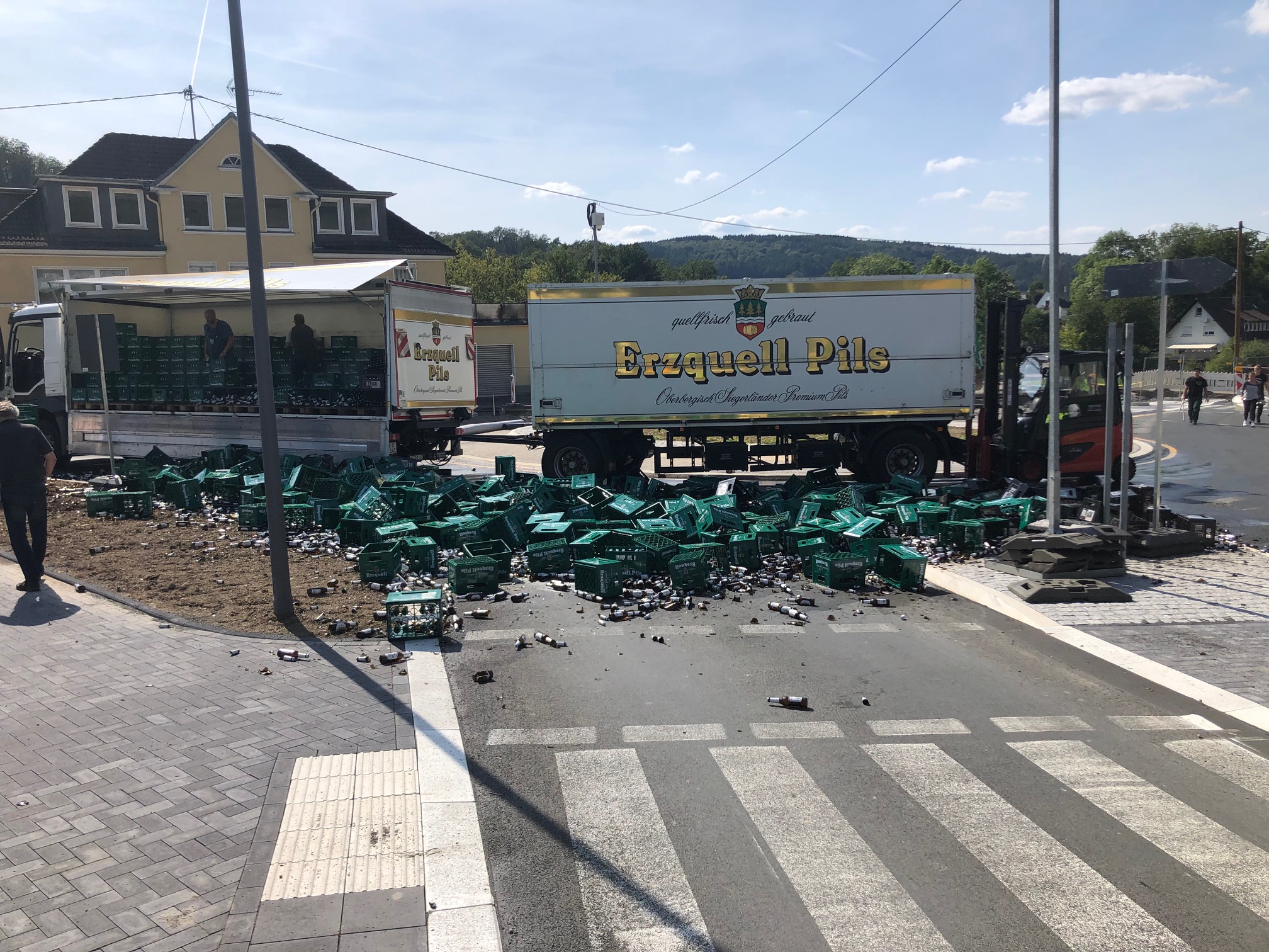 Zurück zu Kreisverkehr in Bielstein: Unfreiwillige Taufe durch herabgefallene Bierkisten