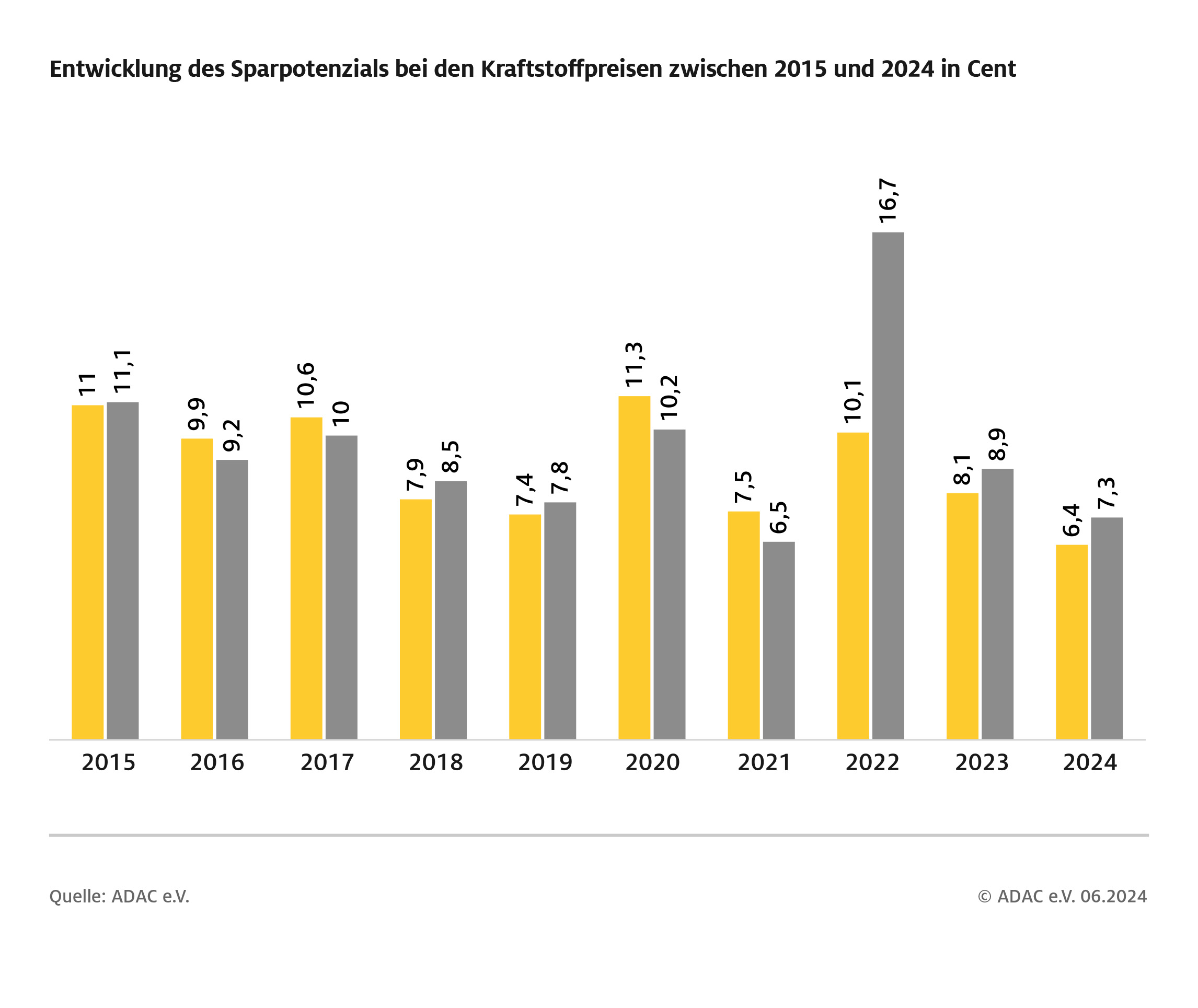 So hat sich das Sparpotenzial beim Tanken seit 2015 entwickelt / Weiterer Text über ots und www.presseportal.de/nr/7849 / Die Verwendung dieses Bildes für redaktionelle Zwecke ist unter Beachtung aller mitgeteilten Nutzungsbedingungen zulässig und dann auch honorarfrei. Veröffentlichung ausschließlich mit Bildrechte-Hinweis. Bildrechte: ADAC Fotograf: © ADAC Grafik