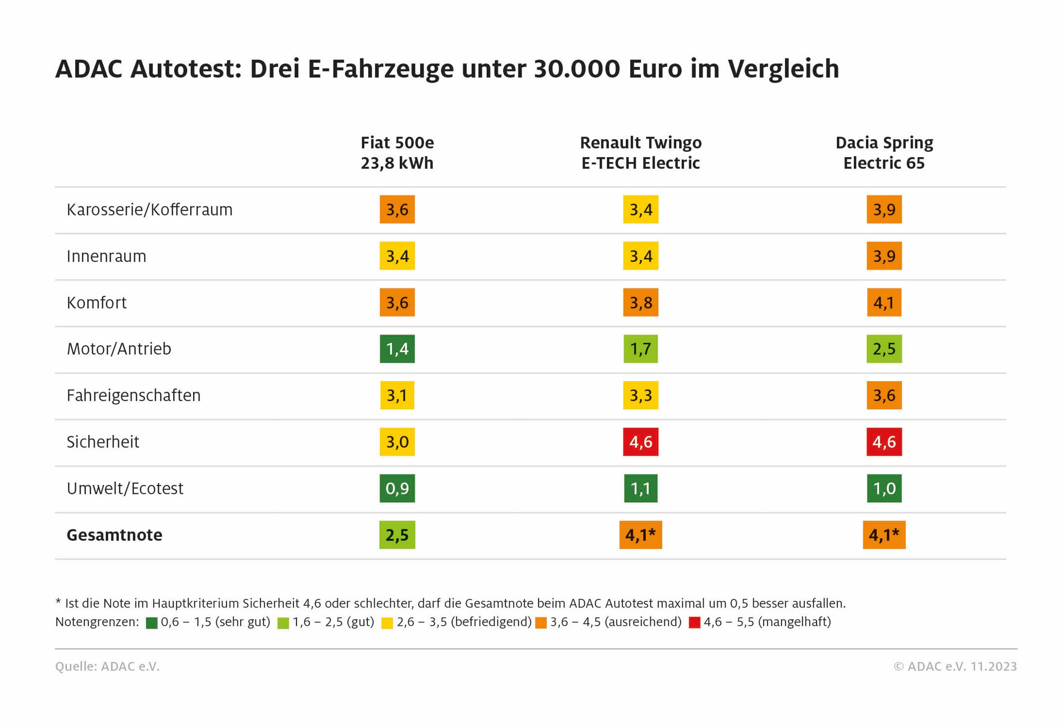 Ergebnistabelle der drei getesteten E-Autos unter 30.000 Euro