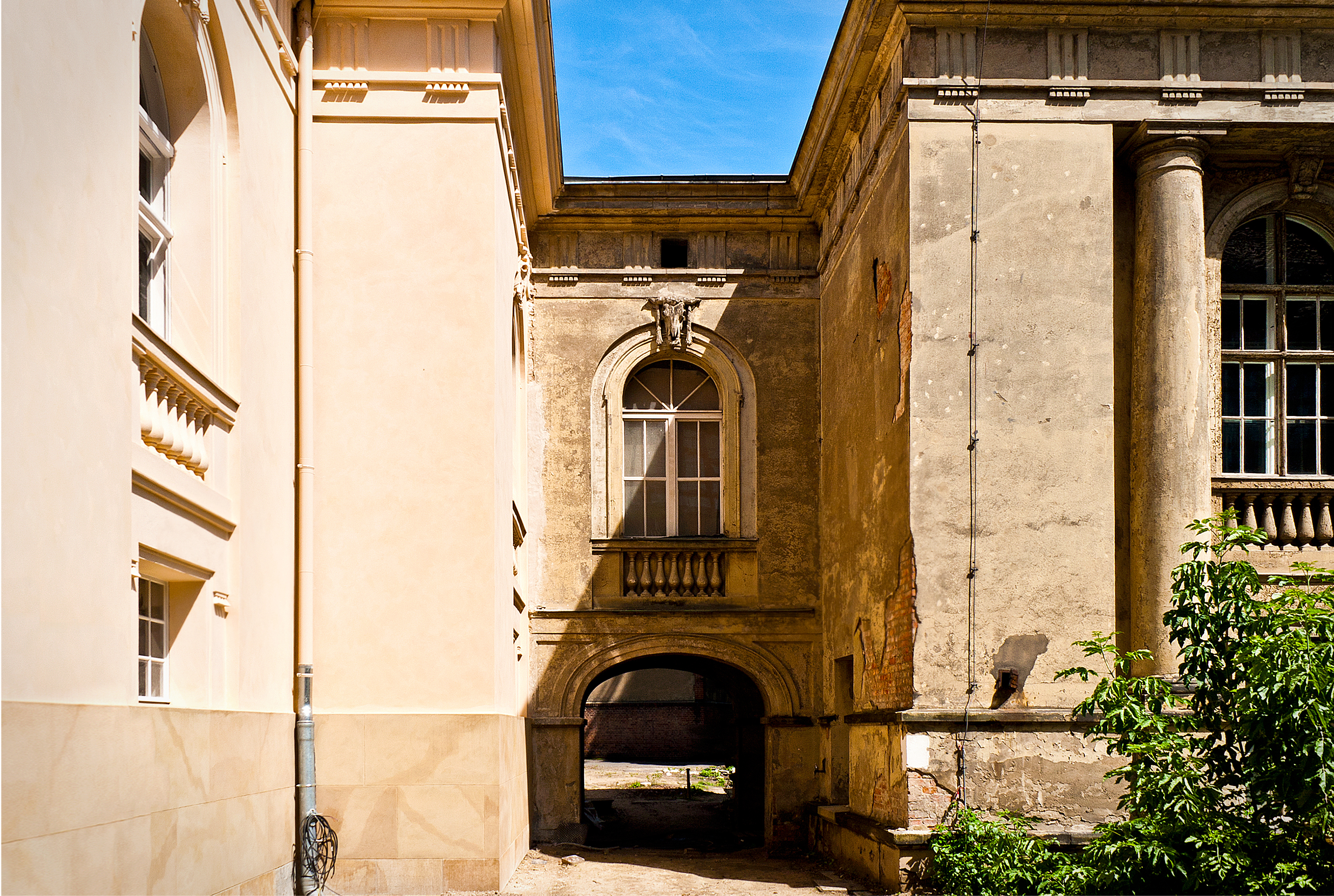 Das unter Denkmalschutz stehende Baudenkmal Anatomisches Theater der Tierarzneischule in Berlin vor und nach der Restaurierung.