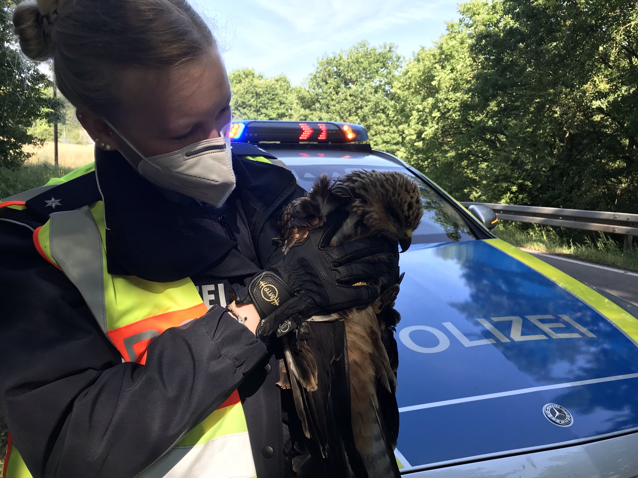 Verletzter Bussard in den Armen einer Polizistin Bild: PI Saarlouis