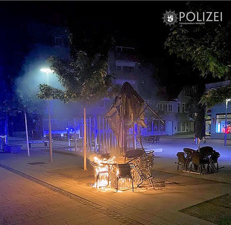 Am Schillerplatz brannten ein Sonnenschirm und Stühle eines Lokals ab. Bild: Polizei