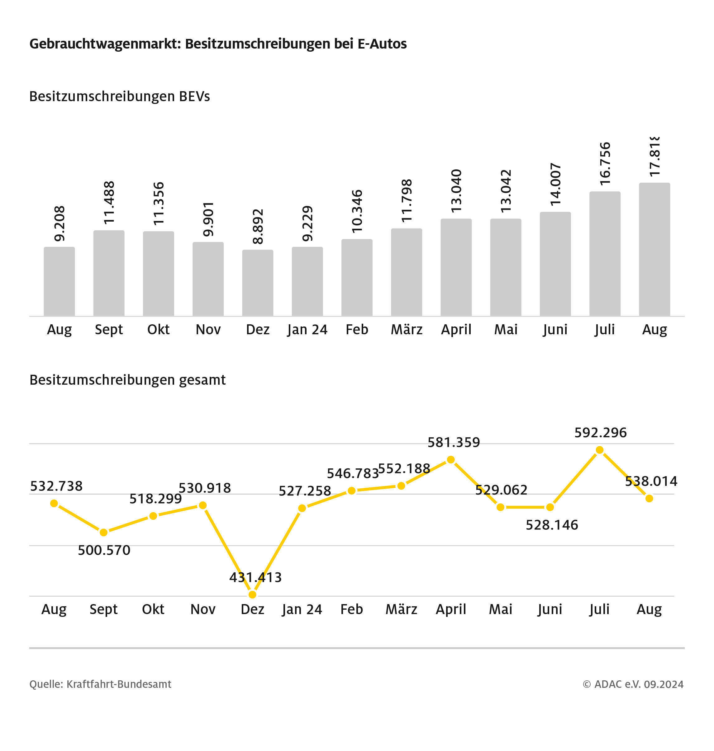 ADAC: Beim Gebrauchtwagenmarkt zeigt sich positives Bild: 17.818 E-Autos haben im August den Halter gewechselt