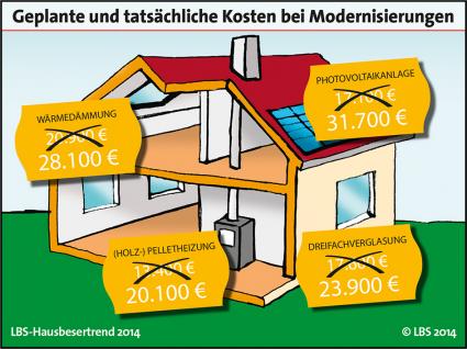 Geplante und tatsächliche Kosten bei Modernisierungen. / Bild: "obs/LBS Infodienst Bauen und Finanzieren/© LBS 2014"