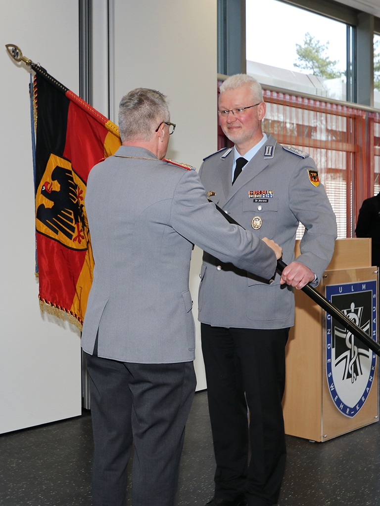 Im kleinen Rahmen übergab Generalstabsarzt Dr. Stephan Schoeps das Kommando über das Bundeswehrkrankenhaus Ulm an Oberstarzt Dr. Jörg Ahrens. Bild: "obs/Presse- und Informationszentrum Sanitätsdienst/Astrid Köpke"